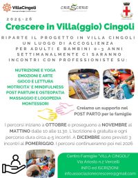 Torna per il terzo anno consecutivo il progetto CRESCERE in VILLA(GGIO) CINGOLI, frutto della collaborazione tra il Centro Famiglie Villa Cingoli e l’Associazione CRESCERE. Un’iniziativa gratuita pensata per accompagnare futuri genitori, neo-genitori, nonni, zii e tutte le figure di riferimento nella crescita dei bambini da 0 a 3 anni. Il progetto offre uno spazio accogliente […]