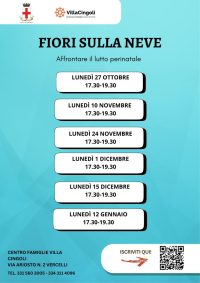 Percorso di sostegno per genitori nell’elaborazione del lutto perinatale Il Centro Famiglie Villa Cingoli propone il progetto “Fiori sulla Neve”, un percorso dedicato a genitori che hanno vissuto l’esperienza dolorosa del lutto perinatale — aborto spontaneo, morte intrauterina o neonatale precoce. 🌱 Perché “Fiori sulla Neve”? I Fiori che sbocciano dalla neve sono il simbolo […]