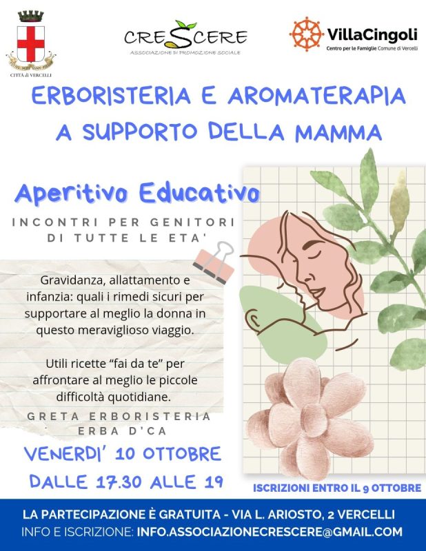 🌿 Venerdì 10 ottobre, dalle 17:30 alle 19:00, presso Villa Cingoli a Vercelli, si terrà un evento speciale dedicato al benessere delle mamme: “Erboristeria e Aromaterapia a Supporto della Mamma”, organizzato in collaborazione con l’ Associazione Crescere in collaborazione.