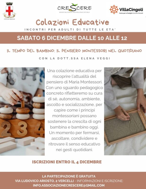 Ore 10:00 – 12:00 Un dialogo aperto e conviviale con la pedagogista Dott.ssa Elena Veggi, che guiderà i partecipanti in una riflessione sull’attualità del pensiero montessoriano. Un’occasione per confrontarsi, condividere esperienze e portare a casa spunti concreti da applicare nella relazione con i figli e nella gestione degli spazi familiari.