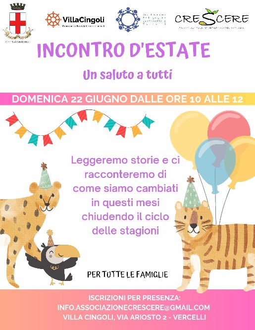 Domenica 22 giugno dalle ore 10.00 alle 12.00 vi aspettiamo al vi aspettiamo al Centro Famiglie Villa Cingoli per un momento di festa, attività condivise e saluti prima della pausa estiva.