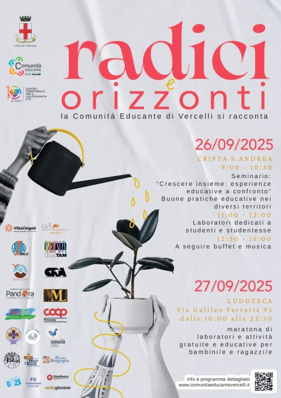 La Comunità Educante di Vercelli (CEV) compie cinque anni e celebra questo importante traguardo con “Radici & Orizzonti”, una due giorni di eventi, laboratori e momenti di confronto aperti a tutta la cittadinanza. L’appuntamento è per venerdì 26 e sabato 27 settembre: un’occasione per raccontare il cammino fatto fin qui e, soprattutto, per guardare al futuro insieme a ragazzi e ragazze, famiglie, insegnanti, istituzioni e realtà del territorio.
