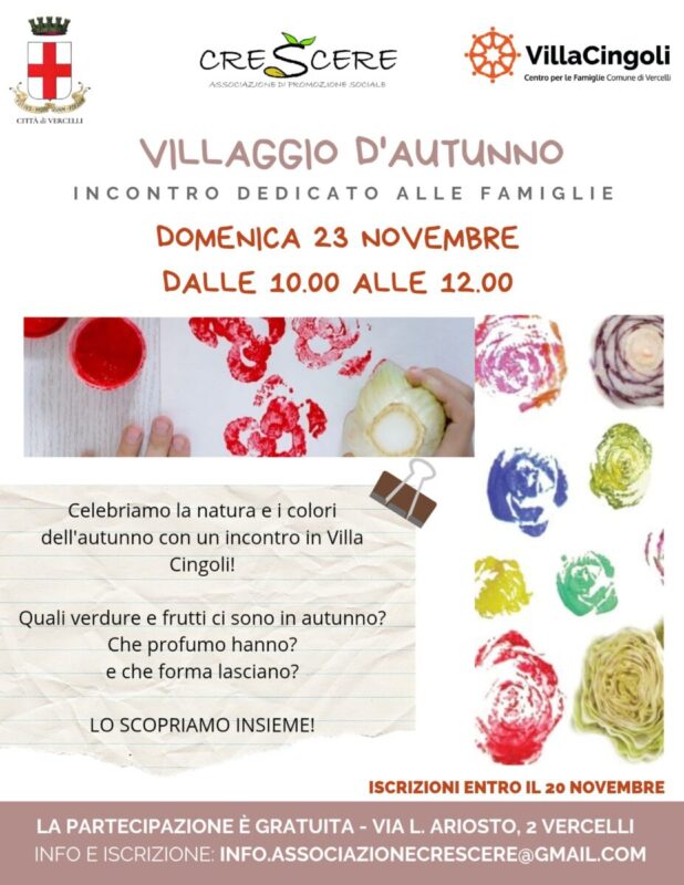 Domenica 23 novembre, dalle 10.00 alle 12.00, Villa Cingoli si trasforma in un piccolo villaggio autunnale, pronto ad accogliere bambini e genitori per un’esperienza immersiva tra colori, profumi e forme della natura.