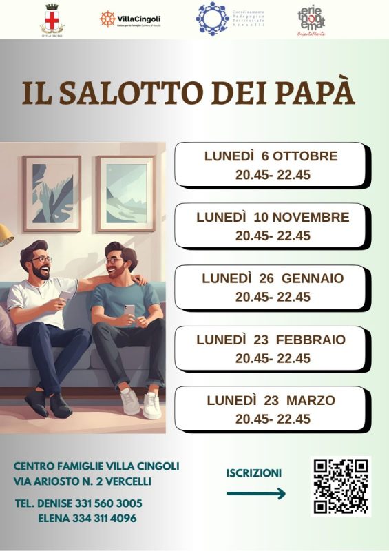 Quest’anno il progetto si sdoppia! Accanto agli incontri del Salotto, nascono i Laboratori Papà & Figli: momenti dedicati al tempo di qualità condiviso, dove padri e bambini potranno giocare, creare, esplorare e divertirsi insieme. Un’occasione preziosa per rafforzare il legame affettivo, vivere esperienze significative e costruire ricordi speciali.